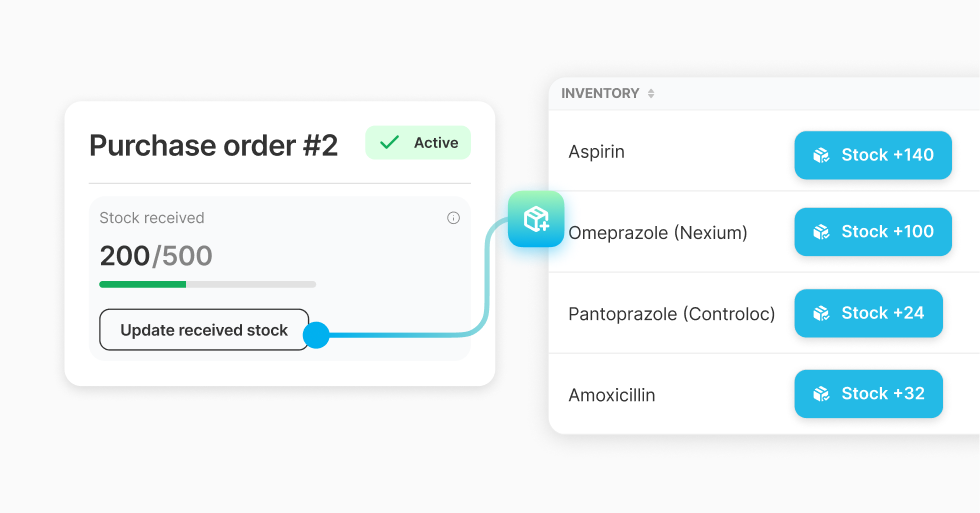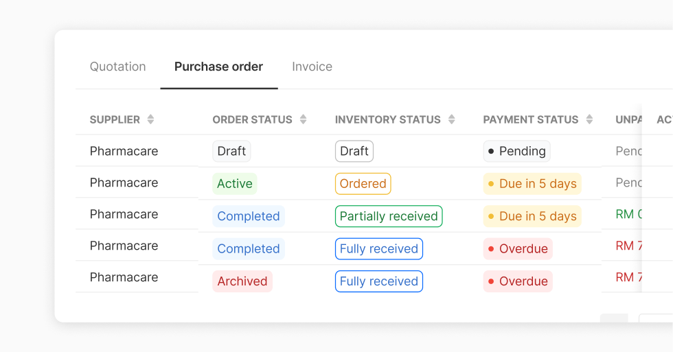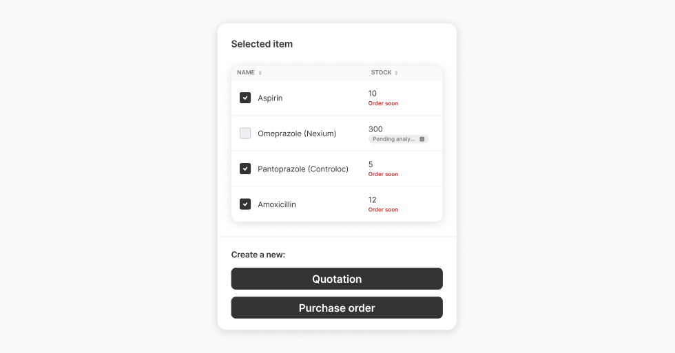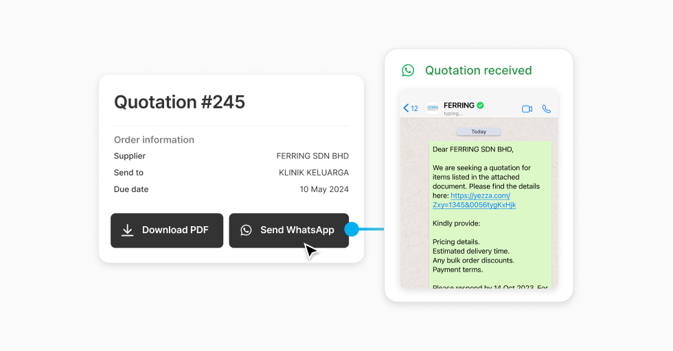 Dengan fungsi Purchase Hub, anda boleh hantar senarai ubat terus ke vendor dalam masa kurang 5 minit.